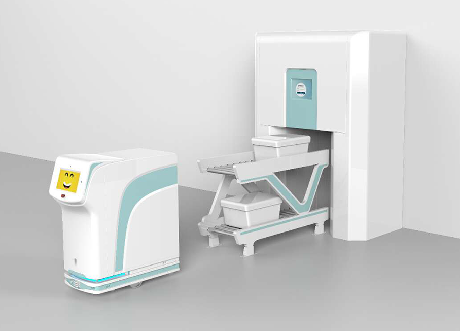科室通过不同颜色的周转箱判断待收物资的种类,根据物资需求的紧急程度及科室忙闲状况进行选择性验收上架。上架完成后只需将空箱投放至回收专线,系统自动规划各周转箱的返回路径,同时设备与系统的结合可实现空箱集放与智能调配等功能。